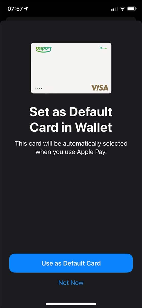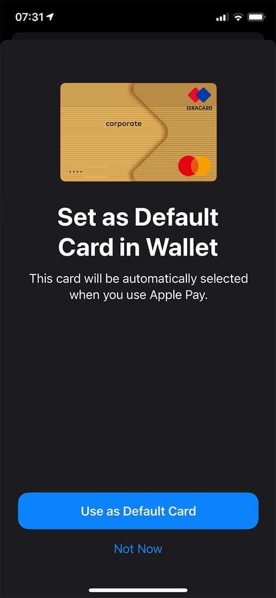 4. לאחר שהזנתם את פרטי הכרטיס והכרטיס התווסף בהצלחה תקבלו אפשרות להגדיר את אותו כרטיס ככרטיס ברירת המחדל שבו התשלום יתבצע כאופציה הראשונה, ניתן כמובן לבחור בכל כרטיס אחר שמוגדר לכם בארנק במידה ותרצו.